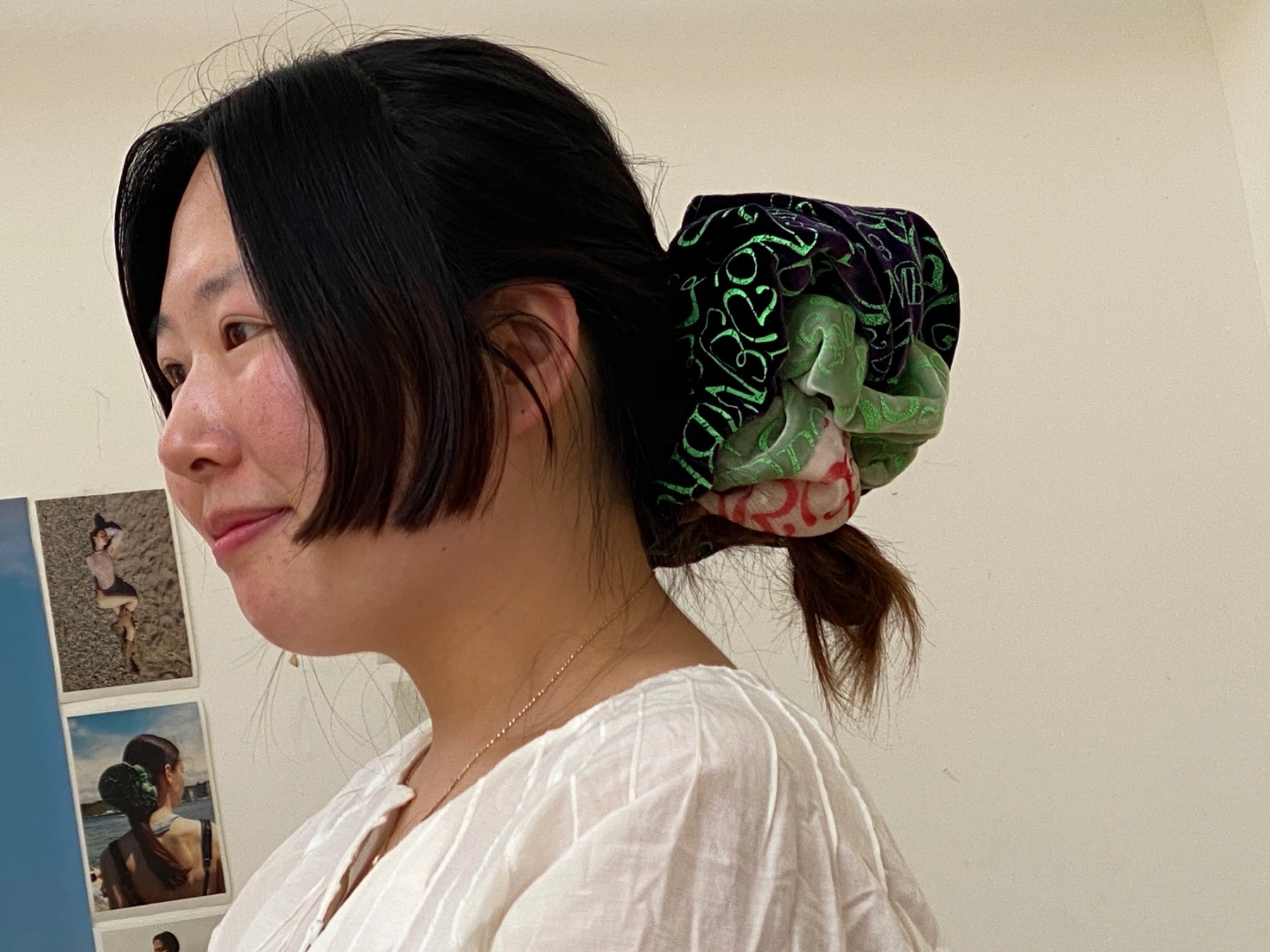 The Reversible Scrunchie Bag is an accessory that can be used as a handbag or a hair tie. Screen-printed by hand in the workshops of HEAD – Genève, made of silk velvet. Design: Lucie Lascaux and Ahn Saeyeon