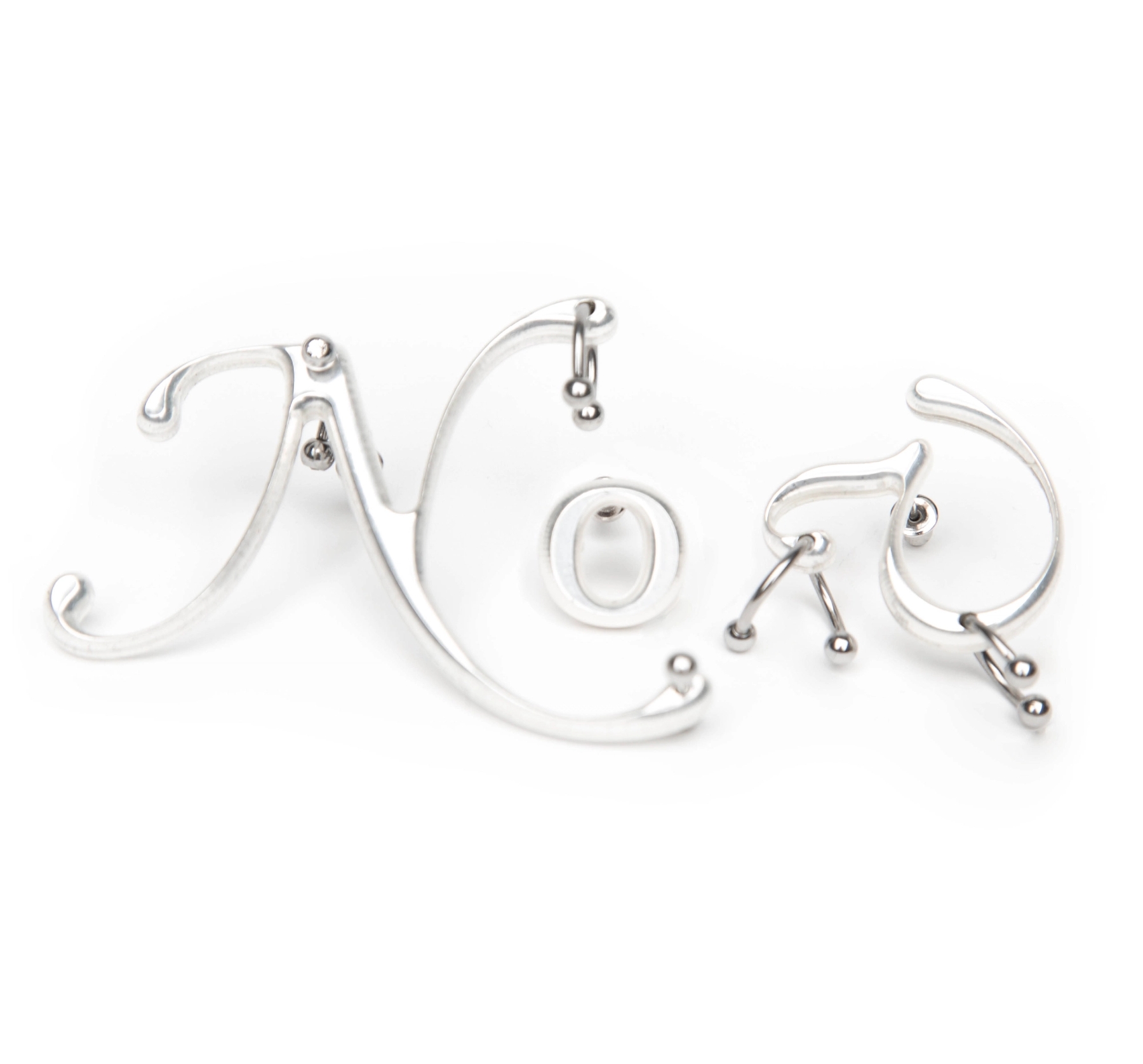 Earrings made up of 3 pieces to be worn together or separately. The N, O and V form the iconic Novembre typography. The Nov Earrings are pierced and decorated with 5 silver-coloured piercings made from lacquered brass and stainless steel. Design: Loris Narduzzi and Oriana Tundo