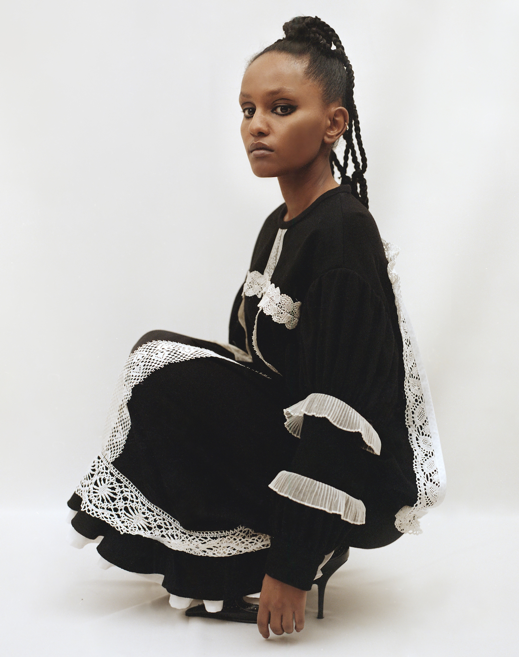 LOOK 9 to 12 : Kauda wears the crazy cat cardigan, the french-american slip and the scrunch ankle warmers / Valérie wears the lace tablier and the dark curtain shorts / Shelim wears the night filet bolero and the sewing machine shorts / Shelim wears the ruined crochet dress