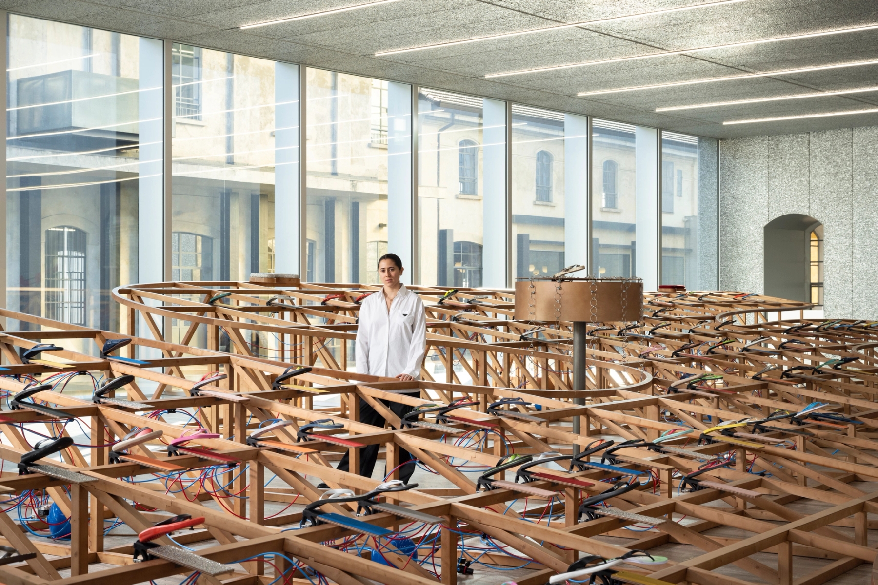 Like most exhibition spaces, Fondazione Prada’s Podium, where “Sole Crushing” is installed, is more or less a blank box (stone floors, glass walls, etc.). Could you talk about some of the technical challenges in working within the acoustic constraints of this space?