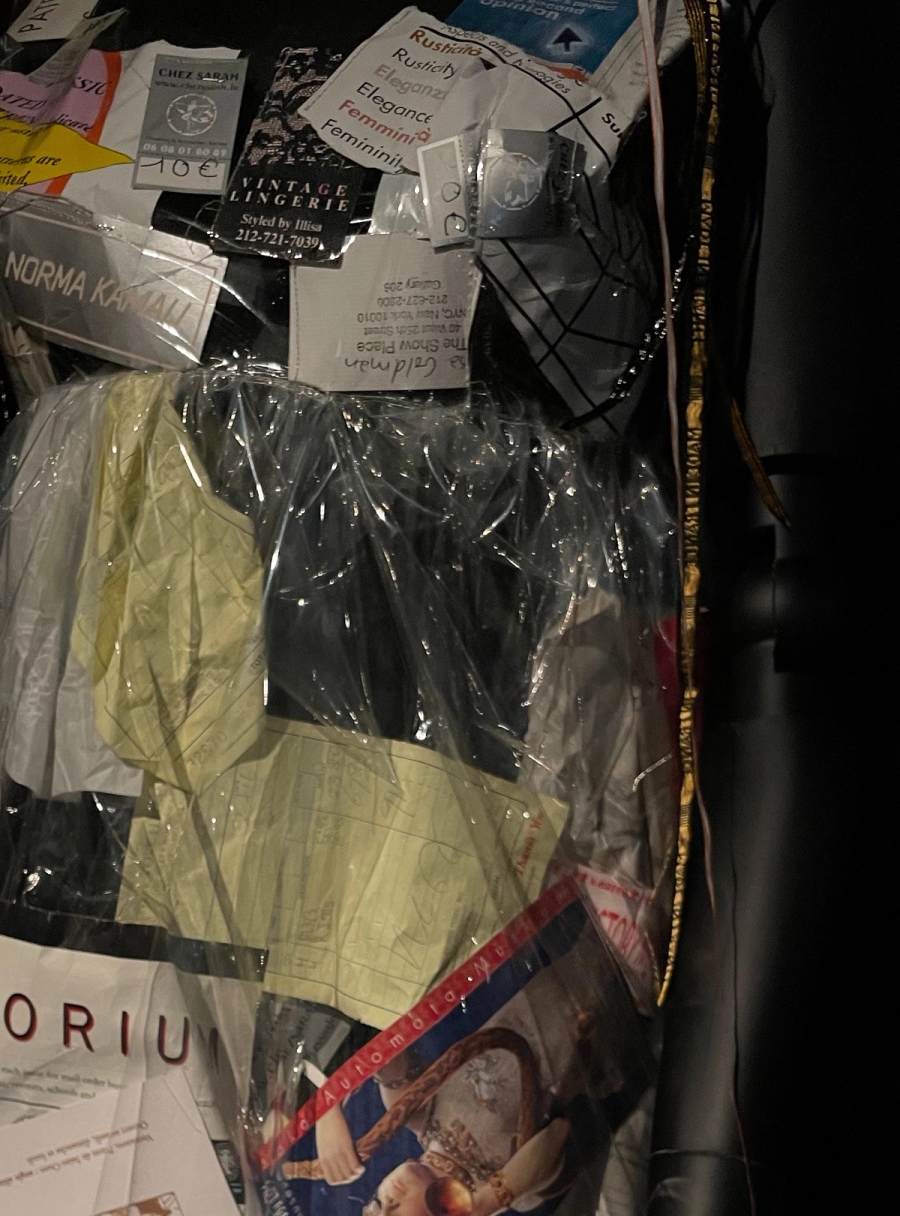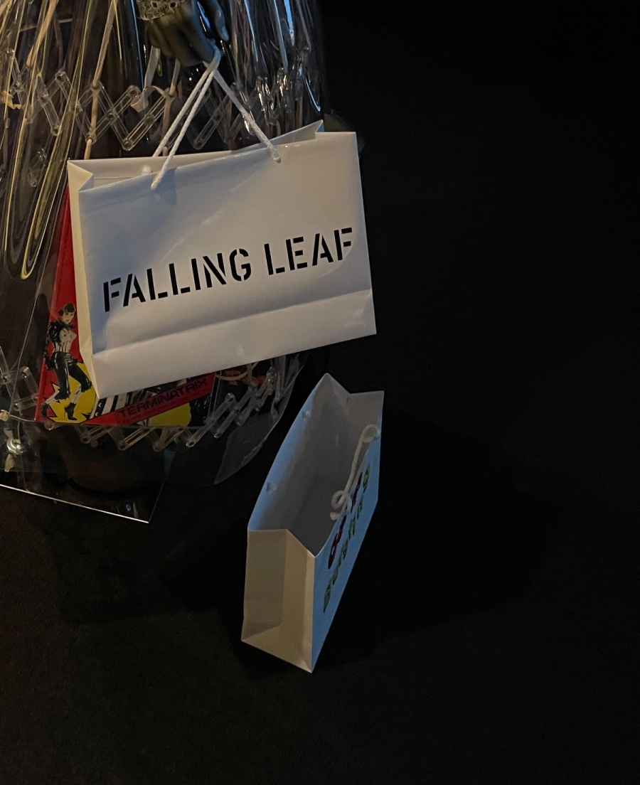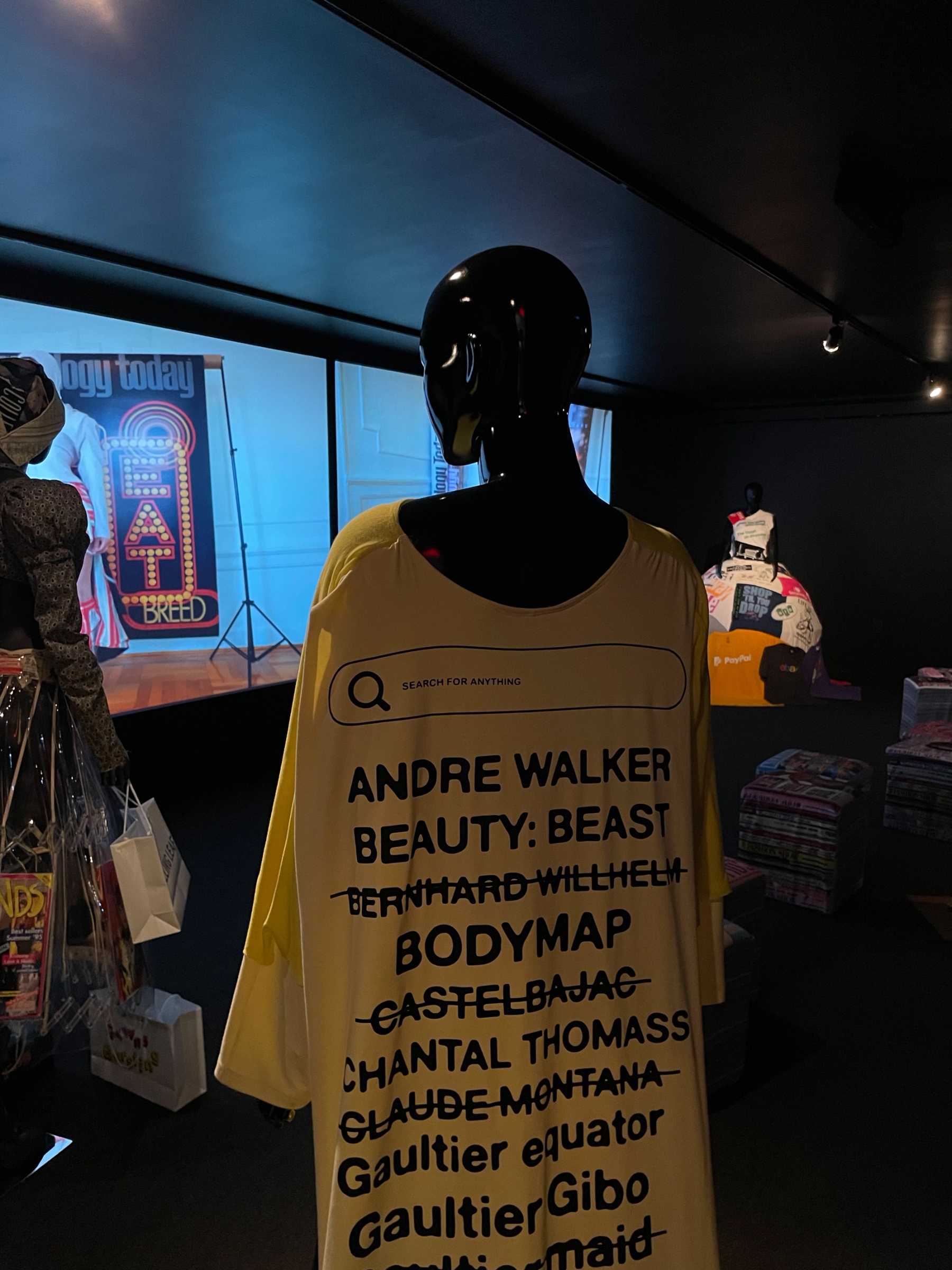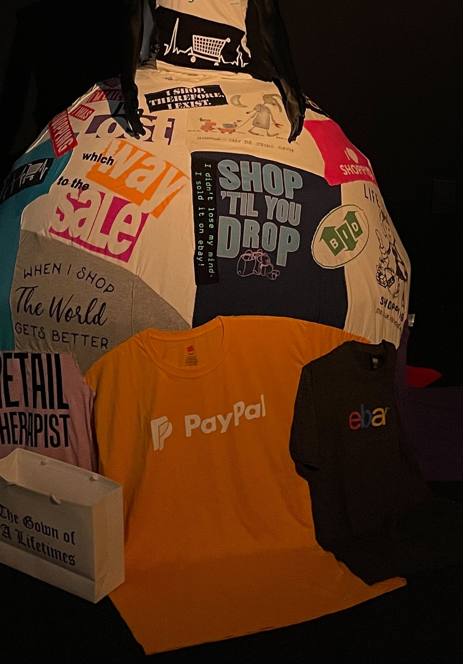 The film is accompanied by an immersive installation featuring costumes worn by Experience that hang on air-brushed animalistic mannequins. There is a boa made up of hangers and vintage clothing tags, a dramatic ball gown composed of novelty “shopping” related t-shirts. The room is filled with shopping bags and chairs that look like stacks of magazines, setting a scene ecovative of the abandoned retail spaces and mall in the film.