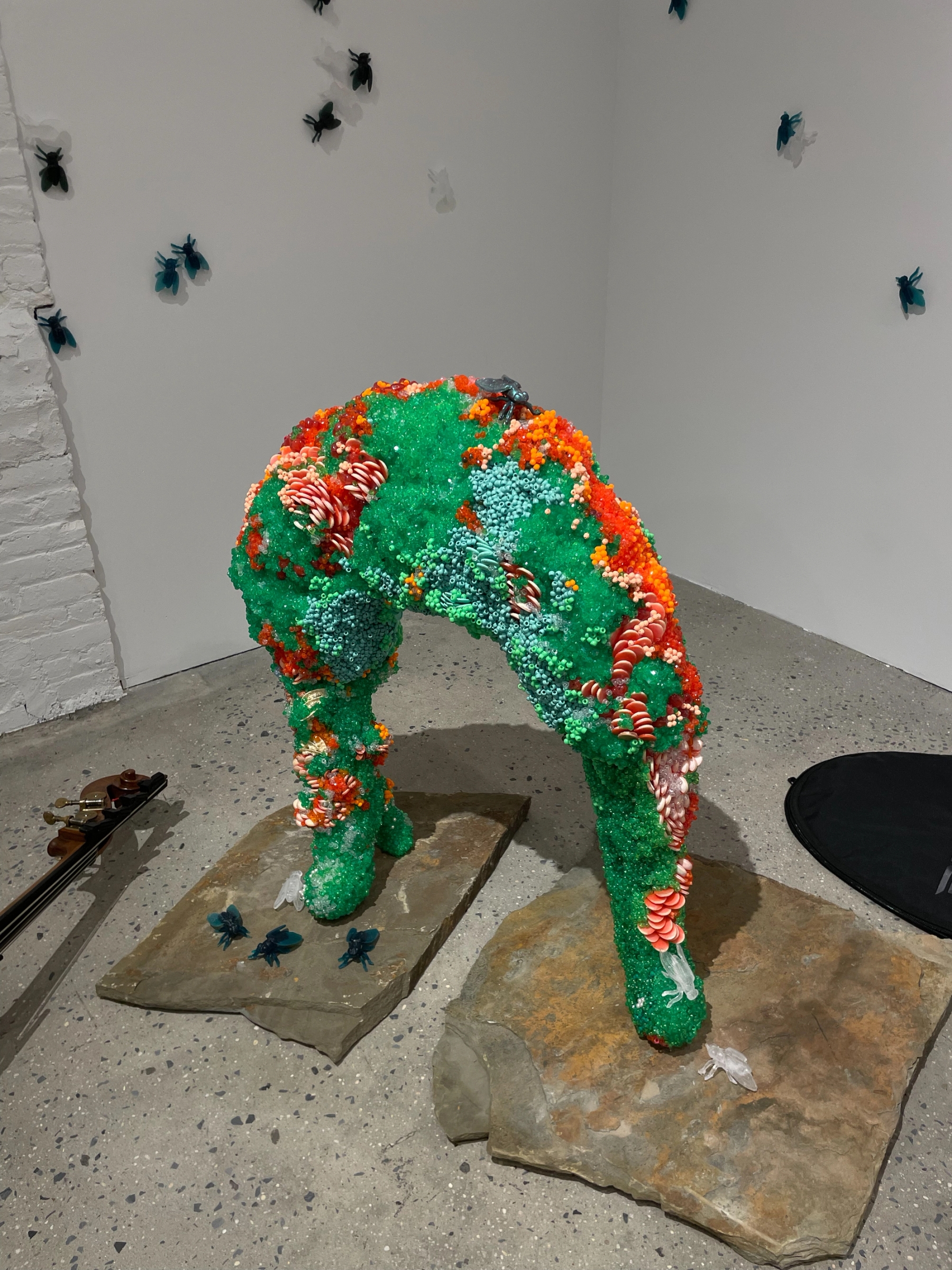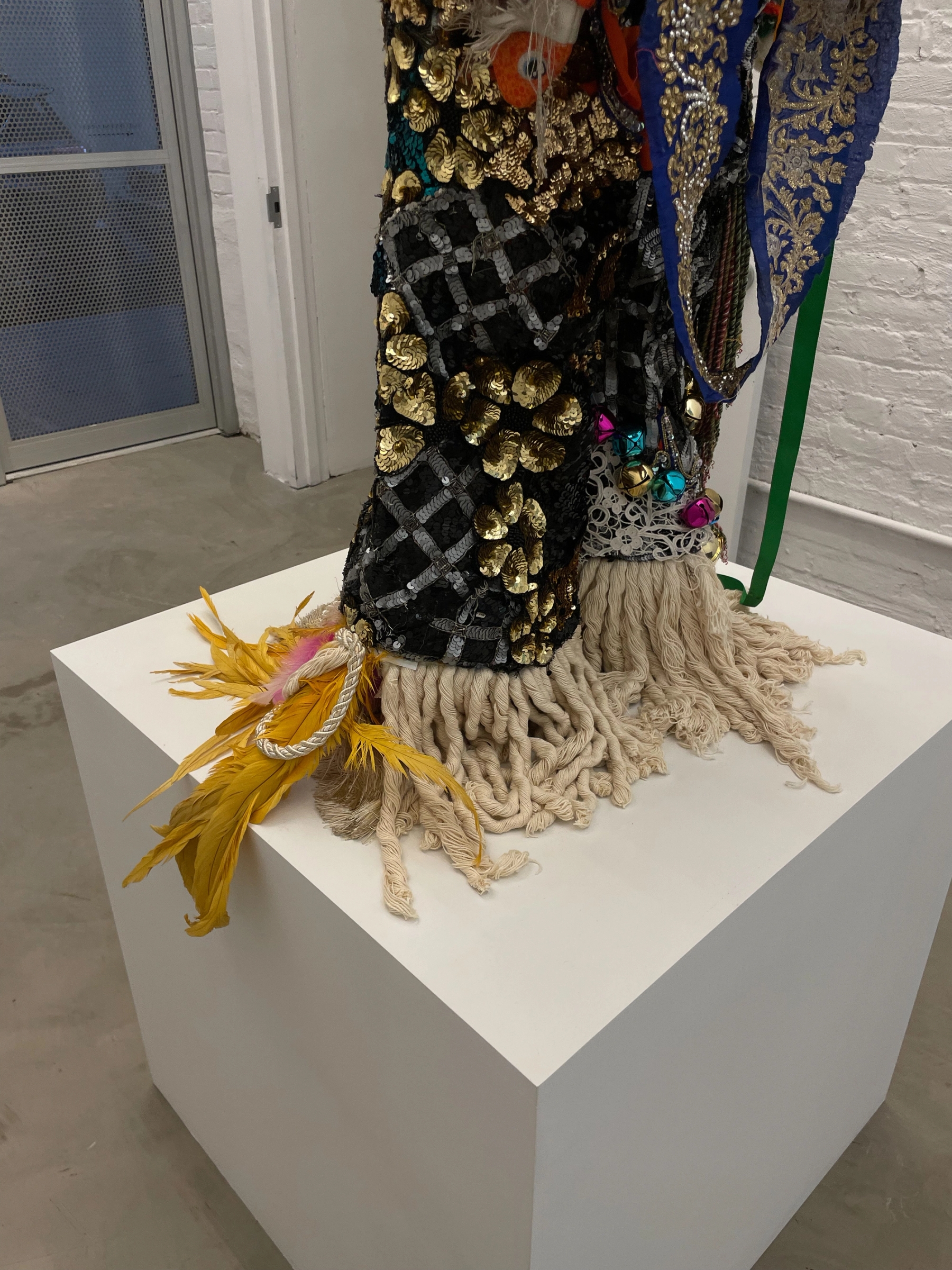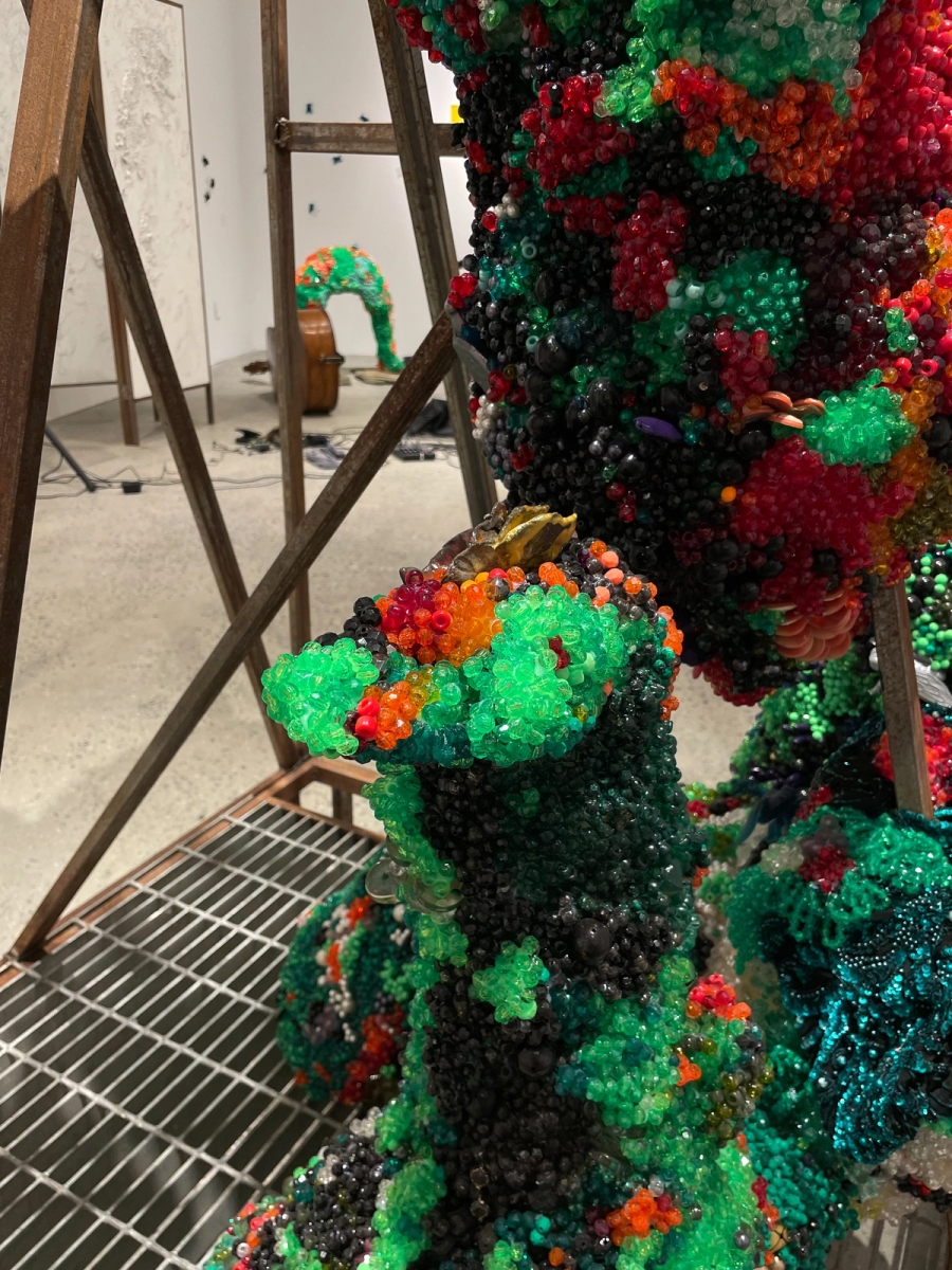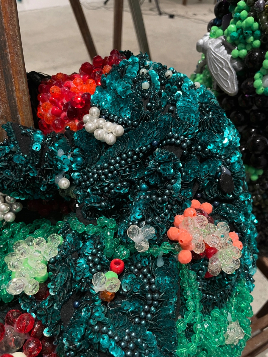De Nieves' exhibition, is explained by a poetic 4 parts. Grave Robber Manifestation: it begins with an ending. Misfortune was the genesis for the central sculpture in this exhibition. A pile of fear and failure and a broken heart kindled the question of what to do with the remains. Rather than yield to fate, Raúl leaned into the symbolic moment and resurrected the misfortune. Little beads and bits of shitty thrift store sequins shine with renewed secrecy. The sculpture's dressed in elevated death drag.